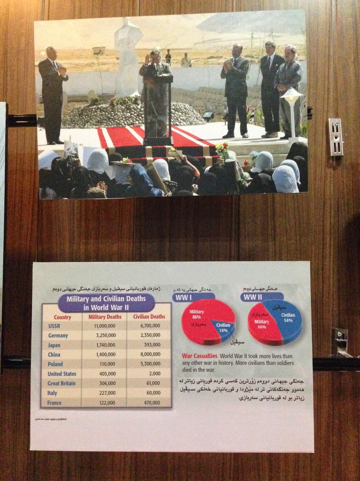 On our mini trip to Halabja, we visited the Halabja Monument and Peace Museum, which showcases the images, films, and documents that represent the chemical gas attacks. The gas attacks mainly took place on March 16, 1988, and killed over 5000 people in just about an hour. Many people were still sleeping, some were on their way to school, some were making breakfast when Saddam Husseins army dropped the chemical gases on the town. Some civilians who live don the outskirts of town managed to escape on foot, but they were still affected by the gases and have illnesses or defects related to the chemicals to this day.